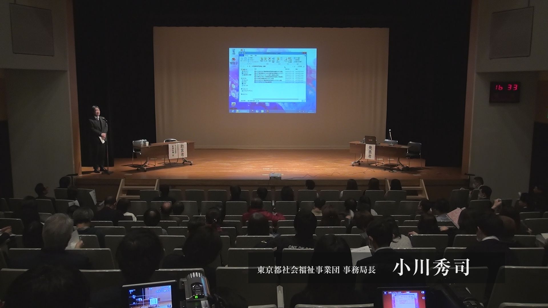 自治体から施設運営を委託されている事業団さまの、研究発表会記録です。例年行われている同事業団さまの発表会。毎年きちんと記録に残し、有効活用されています。こちらのイベント動画記録を当社がお手伝い。マルチカメラによる多角的なカットで、真剣勝負の発表を完全収録しています。スペースやスクリーン画面輝度など、実際は制約の多いロケーション。しかし小型機材の巧みな運用で、理想的な撮影を行いました。